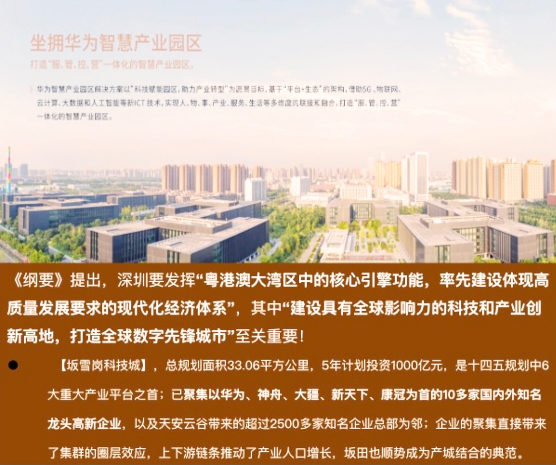 2021年6月發(fā)布《深圳市十四五規(guī)劃綱要》,提出“東進、西協(xié)、南聯(lián)、北拓、中優(yōu)的發(fā)展戰(zhàn)略”,同 坐擁華為智慧產(chǎn)業(yè)園區(qū)